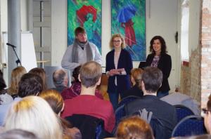 In ihrem Vortrag klärte Ninia neben Irrtümern auch über die noch recht kurze Geschichte des Poetry Slams auf. Obwohl sich die deutsche Szene erst Mitte der 90er Jahre entwickelte, hat sie sich bereits als größte in Europa etabliert. Die deutschsprachigen Meisterschaften für das kommende Jahr werden für die vielseitige Autorin ein Heimspiel, denn die Ausrichtung des SLAMs 2017 wird in der niedersächsischen Hauptstadt durchgeführt. Dort treten die besten Performer des deutschsprachigen Raumes sowohl in Einzeldisziplinen als auch in Teamdisziplinen gegeneinander an. Für die Neulinge des Poetry Slams zeigte Ninia in ihrem Vortrag beispielhafte Auftritte verschiedener Größen wie Nora Gomringer, deren Text „Annahmen über die Stadt“ sogar mit dem Ingeborg-Bachmann-Preis ausgezeichnet wurde.